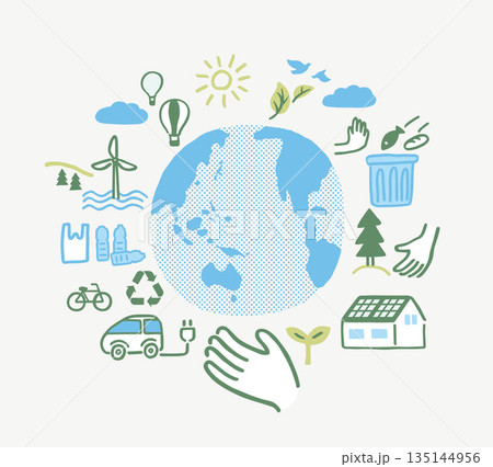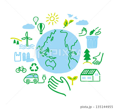 Climate change illustration set. Characters hands holding planet earth, electric car, leaf and other objects as metaphor for green energy, transportation and sustainability. illustration design.