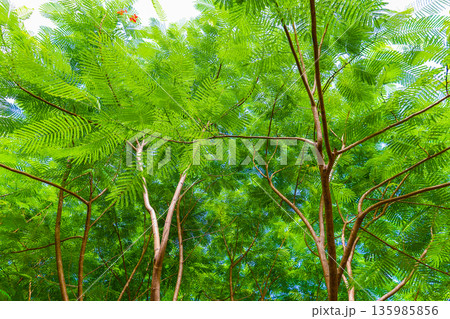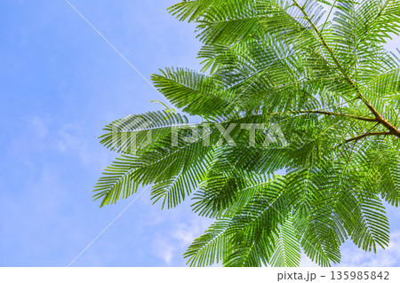 蕨類植物的葉子和藍天構成的風景