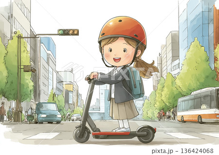 圖:一名戴著頭盔的女學生踩著電動滑板車上學。