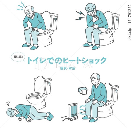 一組插圖,描繪了人們在廁所裡暈倒的情景(中暑、昏厥、失去意識)