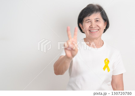 Elderly with Yellow Ribbon for concept of yellow September, Suicide prevention day, Childhood, July Sarcoma, bone and bladder cancer Awareness month, support survivor. Healthcare and World Cancer day