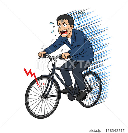 一幅卡通風格的插圖,描繪了一起自行車事故,騎車人因剎車失靈和無法減速而摔倒。