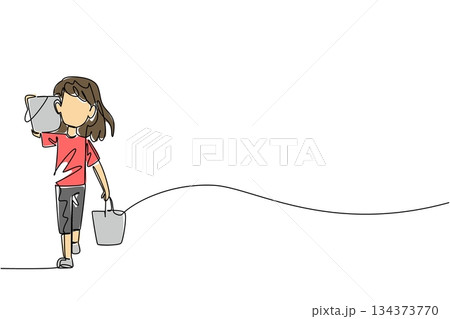 Continuous line drawing of a young girl carrying two heavy buckets, one on her shoulder and one by her side, front view. Showing physical strain of child labor. World Day Against Child Labor event