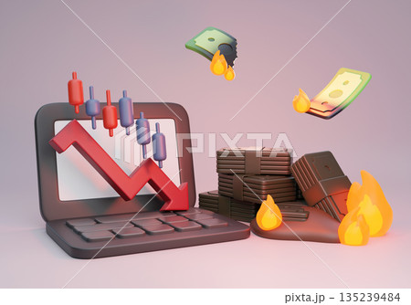 3D Laptop with Bearish Stock Market Downtrend Graph and Burning Money Ash in Background