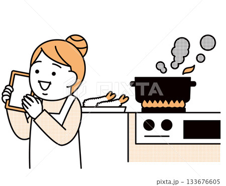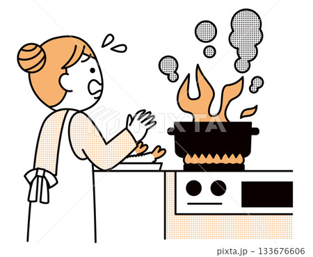 一位女士被爐子裡冒出的火焰嚇了一跳。