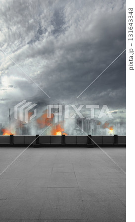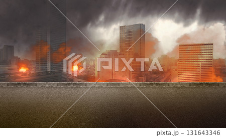Cityscape on fire and in ruins. Damaged buildings, smoke, and fire against a dark sky. The dramatic apocalyptic scene is scary and frightening. Mockup. Copy Space. Wallpaper or Halloween background