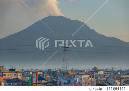 從鹿兒島縣峯良市眺望櫻島,中間聳立著一座高壓輸電塔。