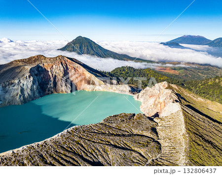 Aerial view of rock cliff at Kawah Ijen volcano with turquoise sulfur water lake at sunrise.Amazing nature landscape view at East Java, Indonesia.Natural landscape colorful sky background