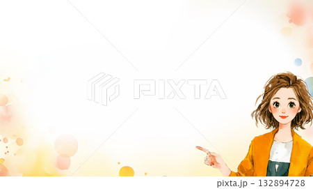 柔和的水彩背景圖,可用作參考資料,圖中還有一位女性角色指向前方指引方向。