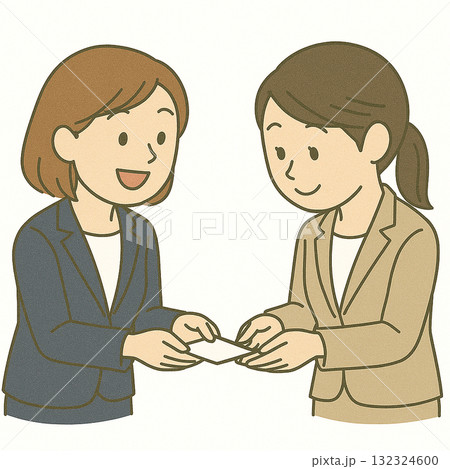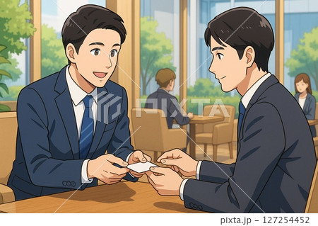 穿著西裝的男女在櫻花盛開的環境中交換名片的插圖(春季,商務禮儀)