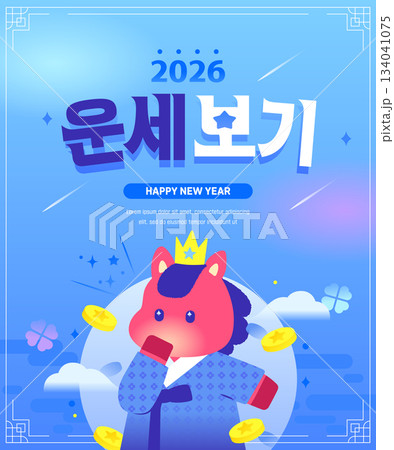 新年賀卡插畫素材。一幅可愛的手繪插圖,描繪了一匹奔跑的馬和它的孩子。