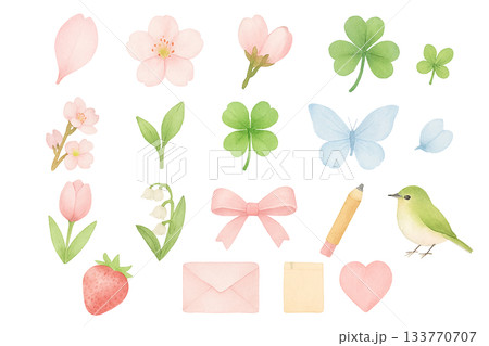 手繪水彩插畫集,描繪了春季花卉和吉祥圖案(櫻花、油菜花、四葉草、非洲菊、蝴蝶)