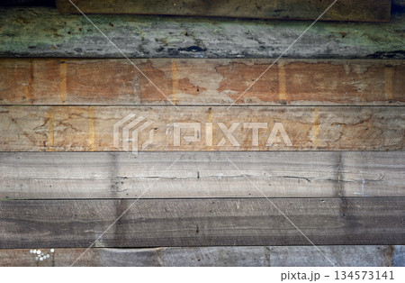 Mixed used cut timber panels colorful painted fade condition and held together with brass rivets graphic illustrated. Wooden texture pattern tropical style.