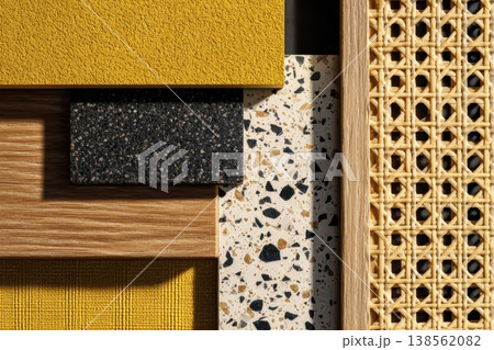 Concrete wall with square hole have cut timber panels mocha tone behind graphic illustration.