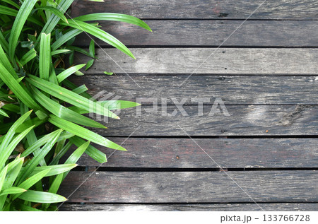 The walkway is made of old wood with pandan leaves planted on the side. There is space for content.