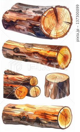 Watercolor Collection of Wooden Logs with Visible Tree Rings Texture