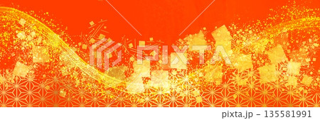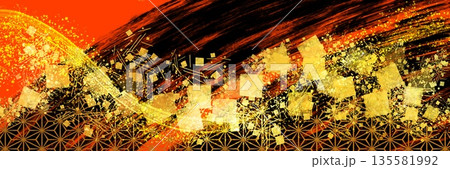 一幅大幅插圖,展現了日式繪畫風格的紋理,金箔、金粉和沙粒飄落在朱紅色背景上。