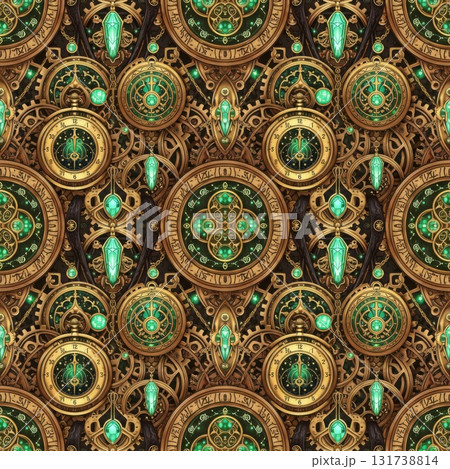 Steampunk clockwork pattern with emerald green accents and golden gears