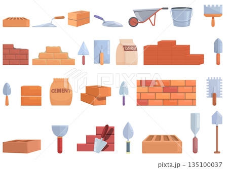 Brick and mortar icons set cartoon vector. Brick construction