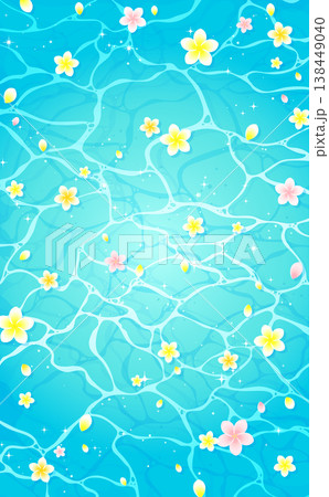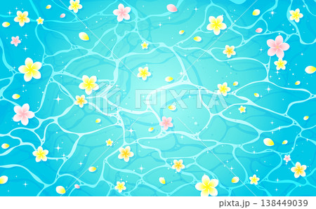 櫻花花瓣在蔚藍的水面上飄舞,這幅插畫背景素材營造出春日寧靜和日式氛圍。