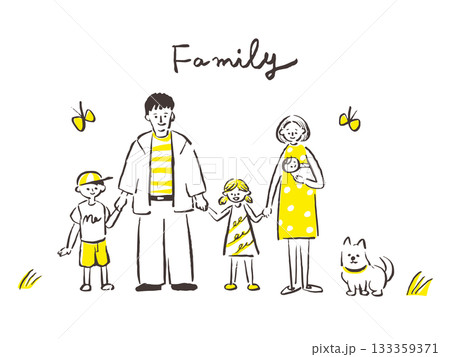 用色鉛筆繪製的一家四口和一隻狗的插圖