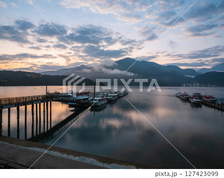 Sunrise view of yacht Marina in Sun Moon Lake, Nantou, Taiwan. it's a famous attraction in Taiwan.