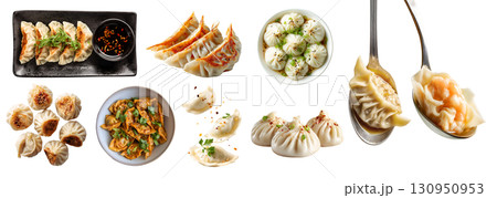 Set of jiaozi Gyoza Pierogi mandu, soup dumplings, tangbao, Chinese steamed bun, Xiao Long Bao baozi, wonton, broth meat filling, isolated on transparent cutout PNG. Many different Mockup