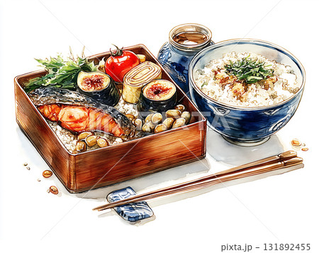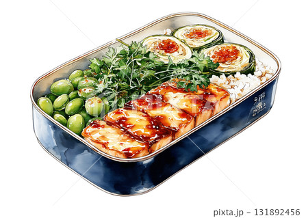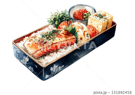 經典便當飯糰和配菜的框架-手繪水彩插畫背景素材