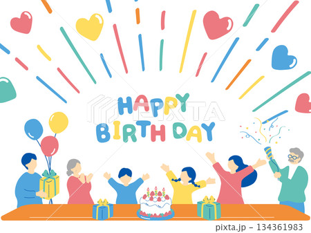 Vector illustration depicting a joyful family gathering with multiple generations celebrating an occasion. Presents, a cake, balloons, and happy expressions set a festive scene.