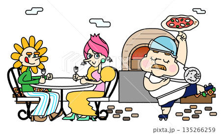 一幅生動的插圖,描繪了一家石爐披薩餐廳的露台座位和工匠的表演。