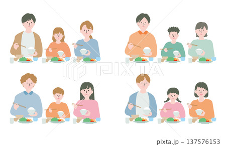 一家人圍坐在餐桌旁享用美食的場景插圖(白色背景、日常生活、晚餐、聚會)