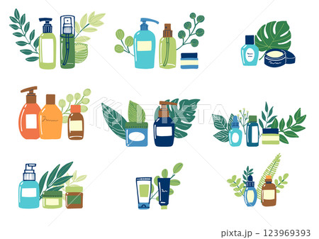 插圖組天然化妝品,包括手繪化妝品和用樹葉裝飾的瓶子