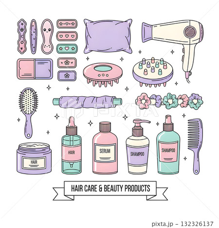 Hair care cosmetic products, accessories stickers set. Silk pillow, scalp massager, hairdryer, heatless curl band and other beauty elements. Modern cartoon concept. illustration design.