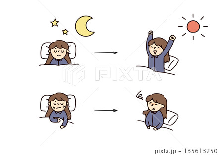 描繪了一個早睡早起、追求健康生活的女孩的插圖