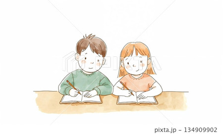 圖:一名身穿制服的男學生和一名身穿制服的女學生正在用鉛筆在筆記本上學習。
