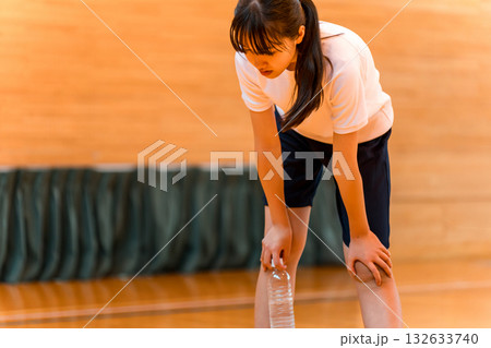 小學、國中、高中女生穿著運動服在體育館用毛巾擦汗