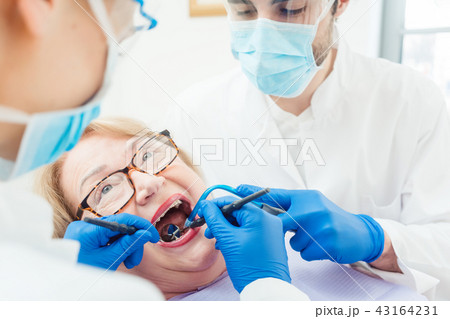 Adult female dentist treating patient woman teeth. Medicine, dentistry and healthcare concept
