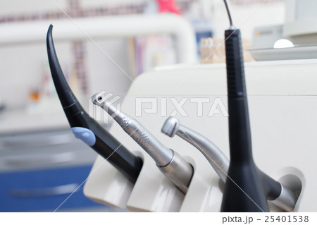 Drill with a tool in the hands of a dentist in black gloves for the treatment of pulpitis, canals in dentistry. Against the background of a patient with glasses