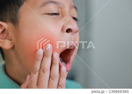 Asian boy suffering from severe toothache with red highlight on cheek, child having dental problem, tooth decay, gum inflammation, sensitive teeth or wisdom tooth pain at home.