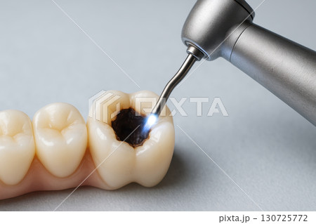 Dental care oral hygiene tooth cleaning procedure showing decayed molar being treated with dental drill for cavity removal and tooth restoration