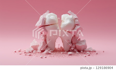 3D illustration of a cracked tooth surrounded by pink crumbling debris on a soft pink background