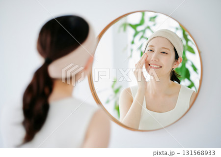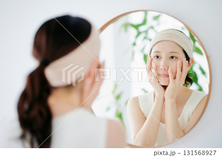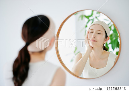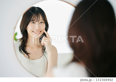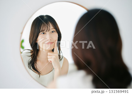 微笑的女人對著鏡子檢查自己的皮膚狀況