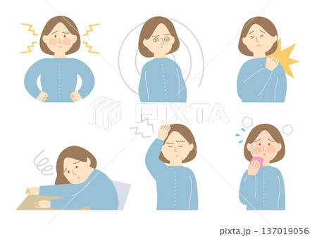 一組感到頭痛等身體疼痛的女性插圖