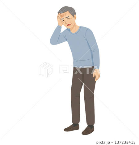 一位老年男子感到頭暈頭痛,他摀著頭,步履蹣跚。