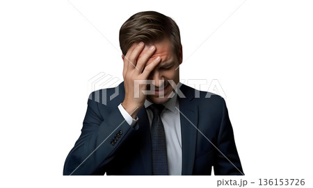 一位男性商人摀著頭,背景為白色