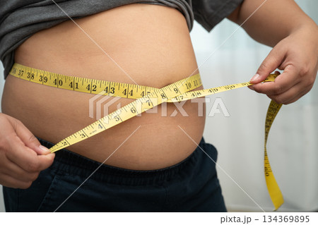 Asian woman with fat belly big size overweight and obesity with measure tape.