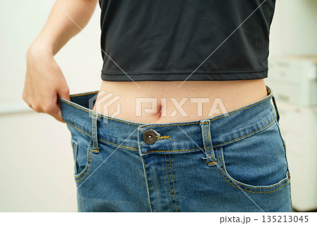 young slim female wearing big or oversize jeans, woman show healthy shape after weight loss. dieting, exercise, body fit and liposuction surgery concept