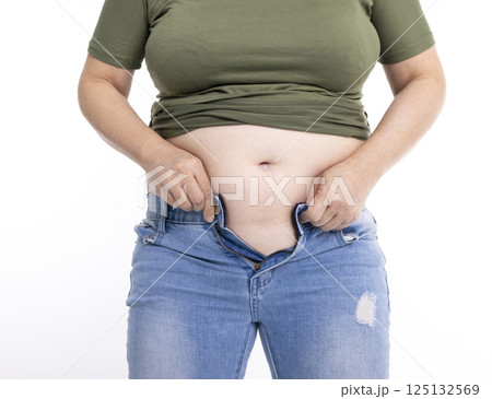 Asian woman show fat belly big size overweight and obesity isolated on white background.