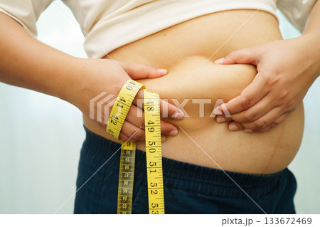 fat woman, fat belly, chubby, obese woman hand holding excessive belly fat with measure tape, woman diet lifestyle concept