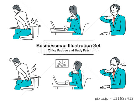圖庫插圖: 一名商人在辦公室感到疲勞和身體疼痛的插圖集